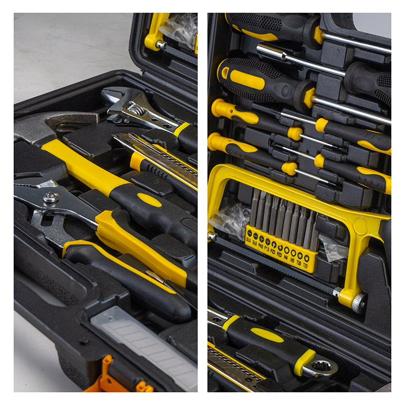 - Κατσαβίδια: PH2*100mm / SL6*100mm•Αντάπτορας μύτης: 6.35mm• Κατσαβίδια ακριβείας : PH00, 0 SL2 .4 , 3.0 • Πριόνι χειρός 160mm• Ανταλλακτικές λάμες πριονιού 2τεμ.• Σετ Μύτες 10τεμ• Πένσα 160mm• Πλαγιοκόφτης 160mm• Σετ Κλειδιά Allen 6τεμ : 1.5-6mm• Γαλλικό Κλειδί 200mm• Κοπίδι 18mm • Ανταλλακτικές Λάμες 10τεμ• Σφυρί Προκοβγάλτης 250gr• Γκαζοτανάλια 200mm • Μέτρο 3m•1pc κάλυμμα σφυριού• Μονωτική Ταινία 5m• Tester Τάσης• Βίδες 54τεμ