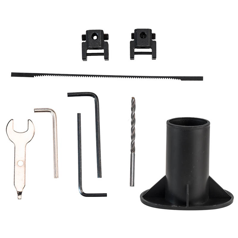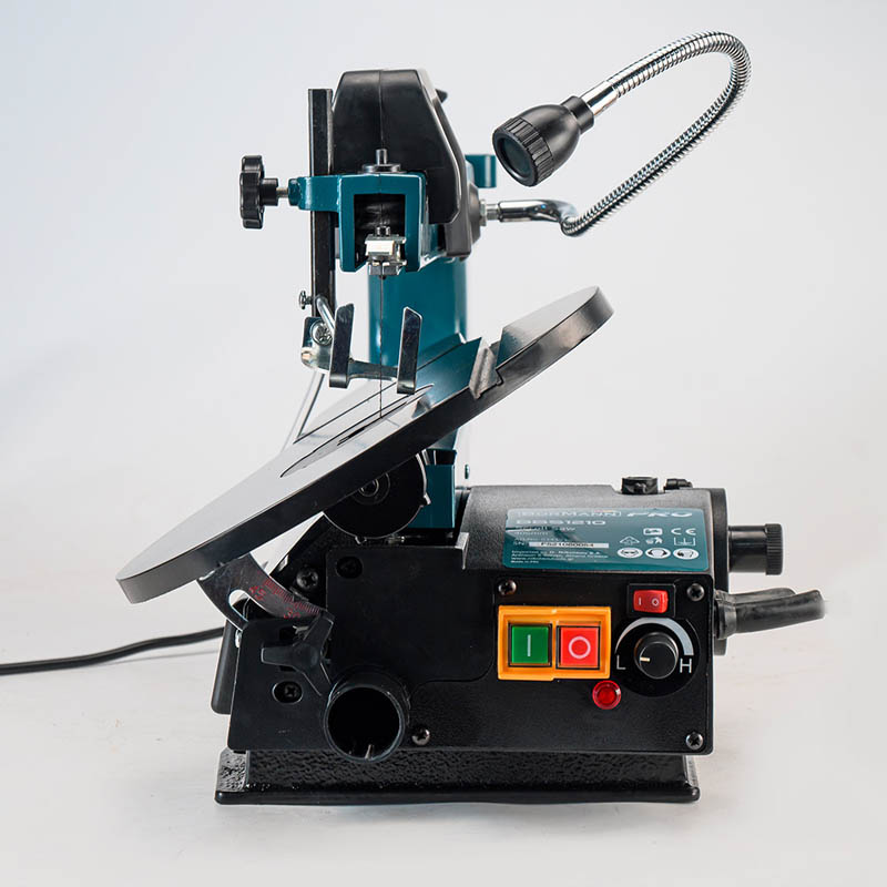Επιτραπέζια σέγα με αλουμινένια επιφάνεια εργασίας με κλίση45°και οδηγό λεπίδας. Διαθέτει ενσωματωμένο φυσητήρα για καθαρισμό του πάγκου εργασίας, διακόπτη ποδιού για άνετη χρήσηκαι φως LED για μεγαλύτερη ακρίβεια στην εργασία. Διαθέτει 103 εξαρτήματα ώστε να προσαρμόζεται σε όλες τις χρήσεις.