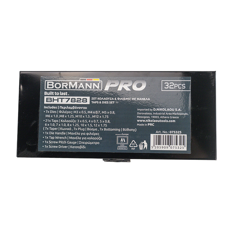 Περιλαμβάνονται:• 7x Φιλιέρες: Μ3 x 0.5, Μ4 x 0.7, Μ5 x 0.8, Μ6 x 1.0, Μ7 x 1.0 ,Μ8 x 1.25, Μ10 x 1.5 , Μ12 x 1.75• 21x Κολαούζα : 3 x 0.5, 4 x 0.7, 5 x 0.8, 6 x 1.0, 7 x 1.0, 8 x 1.25, 10 x 1.5, 12 x 1.75 ( 7x Κωνικό , 7x Βύσμα ,7x Βύθισης) • 1 Μανέλα για φιλιέρες• 1 Μανέλα για κολαούζα• 1 Σπειρώμετρο • 1 Κατσαβίδι