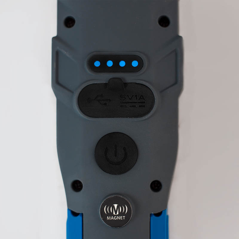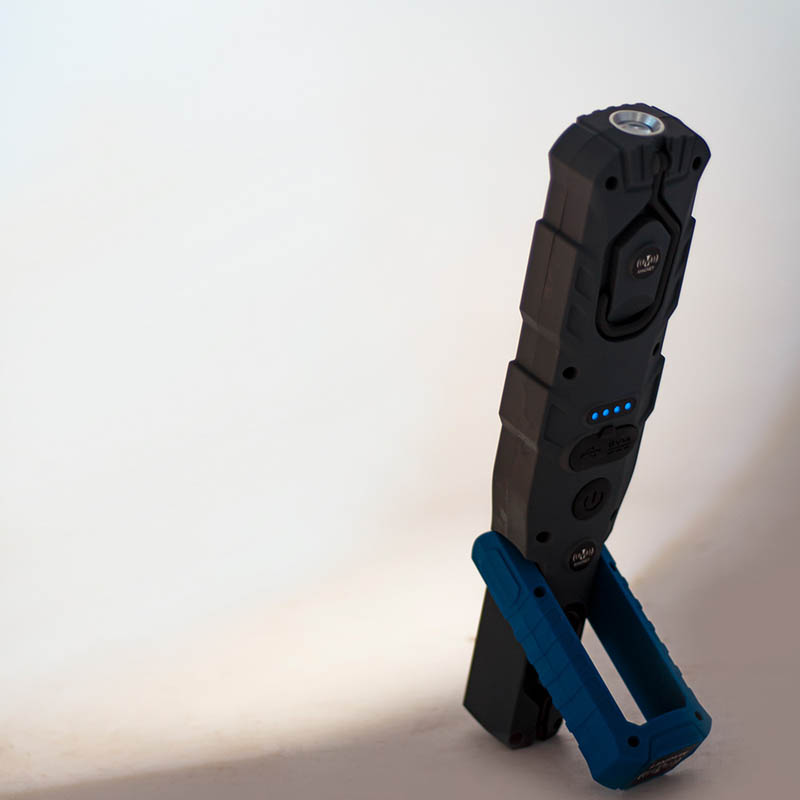 Ισχυρός επαναφορτιζόμενος φακός LED εργασίας με δυνατό μαγνήτη και κινούμενη βάση στήριξης. Στέκεται, αγκιστρώνει και με το εργονομικό σχήμα και κράτημα που έχει διευκολύνει σε δύσκολα σημεία. Με δυνατότητα επιλογής βαθμίδων φωτισμού.